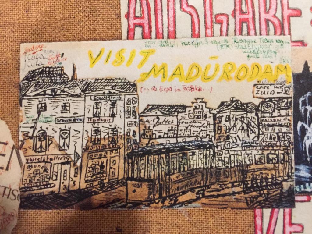 Wel degelijk Haags is een tekening op de achterkant van Station Berlin Ost (ca. 1965), waarbij Van Genk zelf de clou in feite al weggaf door het nadrukkelijke opschrift VISIT MADURODAM plus kleinere, moeilijk leesbare aantekeningen waaronder de reisaanduiding met lijn 3 van de Haagse Tram. Afgebeeld is de omgeving van het oude stadhuis in Den Haag, met ook herberg ’t Goude Hooft – of, zoals Van Genk schrijft, Het Gouden Hoofd. Verder zijn onder meer aangeduid een [R]ywielstalling en Café het ZUID. Voor de huizen rijdt een tram met een schaarbeugel.