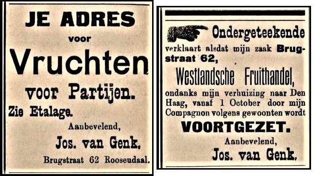 In september kondigt Jozef van Genk aan dat hij naar ’s-Gravenhage vertrekt maar dat de Westlandsche Fruithandel ‘door mijn Compagnon volgens gewoonten wordt voortgezet.’ [12] Die compagnon blijkt oudere broer Cornelis/Kees (1884-1945) te zijn die de winkel inderdaad overneemt, trouwt, een gezin sticht en de rest van zijn leven in Roosendaal blijft wonen. Het aantal advertenties in De Grondwet neemt onder zijn eigenaarschap drastisch af; ook worden ze aanmerkelijk soberder. Jozef zal in Den Haag ongetwijfeld verder zijn gegaan met adverteren, maar onbekend is in welke krant of blad.