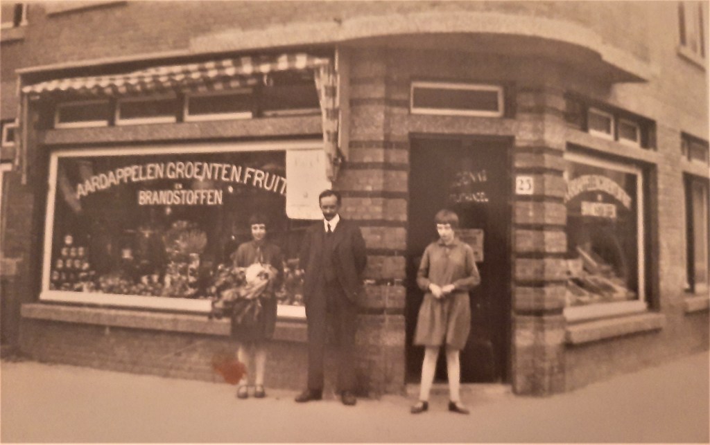 Jozef van Genk met zijn twee oudste dochters voor zijn winkel in Voorburg, 1927. Links Leny, rechts Tiny (archief Marijke Bijmans)