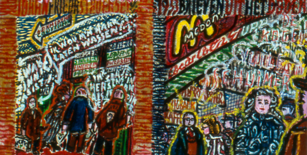 Eerder schreef ik al dat een aantal werken van Willem van Genk een rijk bewerkte achterkant kent, met knipsels, tekeningen en teksten die in verband lijken te staan met de voorstelling op de voorkant. Het gaat daarbij om werken op karton of hardboard uit de periode 1964-1969, van Metrostation Moskou en Smolny Kathedraal (beide op karton) tot Great Railroads of the World. Ook eerder en later bracht Van Genk nog knipsels en vooral teksten op de achterkant van zijn werken aan, maar niet meer zo uitgebreid als in de genoemde periode.