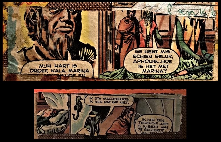 De twee fragmenten passen duidelijk aan elkaar, maar de belangrijkste vraag is natuurlijk: uit welk stripverhaal zijn de plaatjes afkomstig? In de tekstballonnen worden enkele namen genoemd: Kala, Marina en Aphonis. Ook is er sprake van ‘de geleerden van Titan’. Eerdergenoemde Ron Roboxo suggereerde dat het zou kunnen gaan om een fragment uit een stripverhaal van Bert Bus. Bas Schuddeboom van de Comiclopedia betwijfelde dit echter en neigde naar een Britse strip uit een blad als Sjors of TV 2000, of eventueel uit een Belgisch tijdschrift.