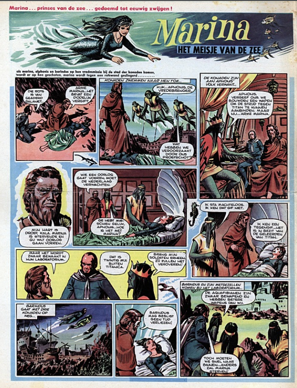 Uiteindelijk wist ik zelf, na enig googelen, de oplossing te vinden: het ging om een fragment uit de strip Marina, het meisje van de zee van Rab Hamilton. Inderdaad was dit van oorsprong een Britse strip (“Marina, Girl of the Sea”) die in Nederland was verschenen in TV2000, een stripblad dat tussen 1966 en 1969 werd uitgegeven door de Nederlandse Rotogravure Mij. Die laatste bracht ook het damesblad Eva uit en concurreerde met de Geïllustreerde Pers, uitgever van het damesblad Margriet én de stripbladen Donald Duck en Pep. TV2000 was de Nederlandse mengvorm-versie van de Britse stripbladen TV Century 21 (later TV21) en Lady Penelope voor respectievelijk jongens en meisjes.
