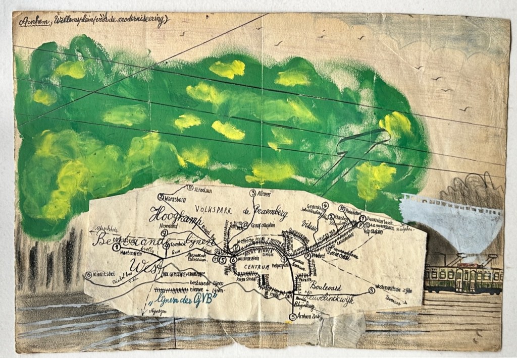 De tekening werd in 2023 aangeboden door galerie J-P Ritsch-Fisch en bleek toen aan de achterkant eveneens een afbeelding te hebben: een schetsmatige tekening in verf, inkt en potlood met een bomenrij en een tram, met daaroverheen een plattegrond van Arnhem. Linksboven de tekst Arnhem; Willemsplein (vòòr de modernisering).