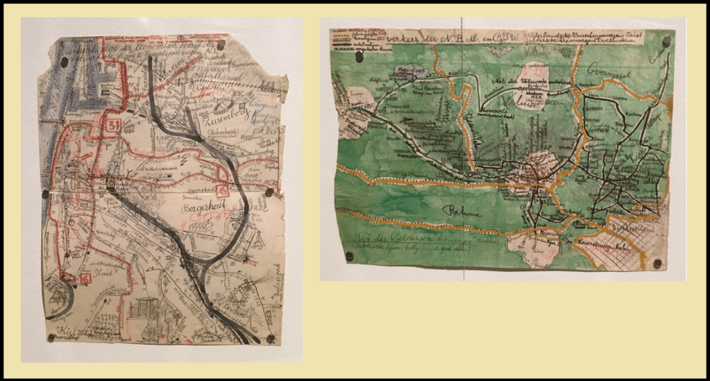 Plattegrond van het midden en oosten van Nederland, met Utrecht, Amersfoort, Apeldoorn, Arnhem en Nijmegen (Nimwegen) als grotere stadskernen. Waar Van Genk het in zijn vroege tekeningen vaker over de GTW (Geldersche Tramwegen) heeft, is het noemen van de NBM (Nederlandsche Buurtspoorweg-Maatschappij) vrij uitzonderlijk.
