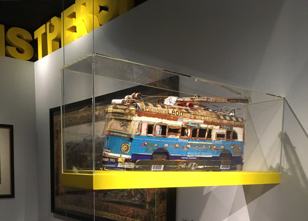 Belangstellenden konden van de kavels van hun keuze een conditierapport opvragen. Dit bevatte in het geval van de werken van Van Genk niet heel veel meer informatie dan al op de website te vinden was. Bij Panorama Moskou werd vermeld dat het werk gerestaureerd was ‘in 2002 following multiple signs of wear, holes, and creases in the paper. It was reinforced with a Japanese paper lining’ (daarover dadelijk meer). De trolleybus was in een ‘Good overall condition’, maar ‘The artwork is dusty’ en er was sprake van ‘Oxidation of the adhesive’. Dat laatste, oxidatie van de lijm, was niet echt een verrassing, aangezien Van Genk werkte met de lijm die voorhanden was (meestal Bison kit). Meer in het algemeen vormen de bus-assemblages van Willem van Genk een uitdaging voor restaurateurs en zullen ze mogelijk, indien niet goed behandeld, over enkel tientallen jaren uit elkaar vallen.