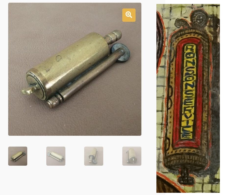 Nog maar een keer Ronson. Eerder (hier en hier) maakte ik melding van buizen met het woord RONSONSERVICE, te zien op de werken Zelfportret – Zwakzinnigennazorg (WVG-0096), Zelfportret in De Ark (WVG-0081) en Paranăsky Kultur (WVG-0078). Er leek een verband te zijn met het aanstekermerk Ronson, dat inderdaad ook een servicepakket op de markt had gebracht, bedoeld voor het bijvullen en/of onderhouden van de aansteker. Daar stopte de connectie, omdat de door Van Genk afgebeelde buizen in niets leken op de elementen uit een dergelijk servicepakket, noch op een Ronson-aansteker. Op Marktplaats verscheen echter een aansteker die er op leek: