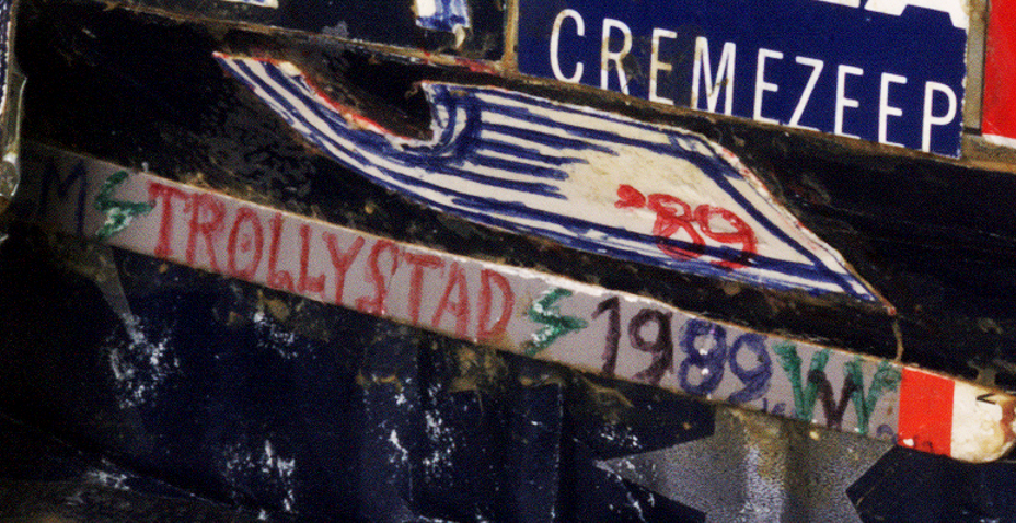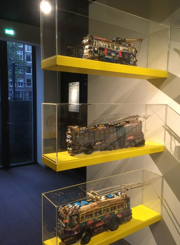 Dan iets over de datering van Willem van Genks trolleybus-assemblages. Die worden algemeen, ook door mij, beschouwd als zijnde gemaakt in de jaren tachtig. Het is moeilijk de vinger achter een meer precieze datering te krijgen, omdat de bussen niet van een jaartal zijn voorzien – zo nam ik altijd aan. De Collection de l’Art Brut in Lausanne bezit drie trolleybus-assemblages, waarvan er twee op hun website staan. Nummer drie, net als de andere twee eind jaren negentig aangeschaft via galerie Hamer, staat afgebeeld in de catalogus van de tentoonstelling Woest op bladzijde 82,
