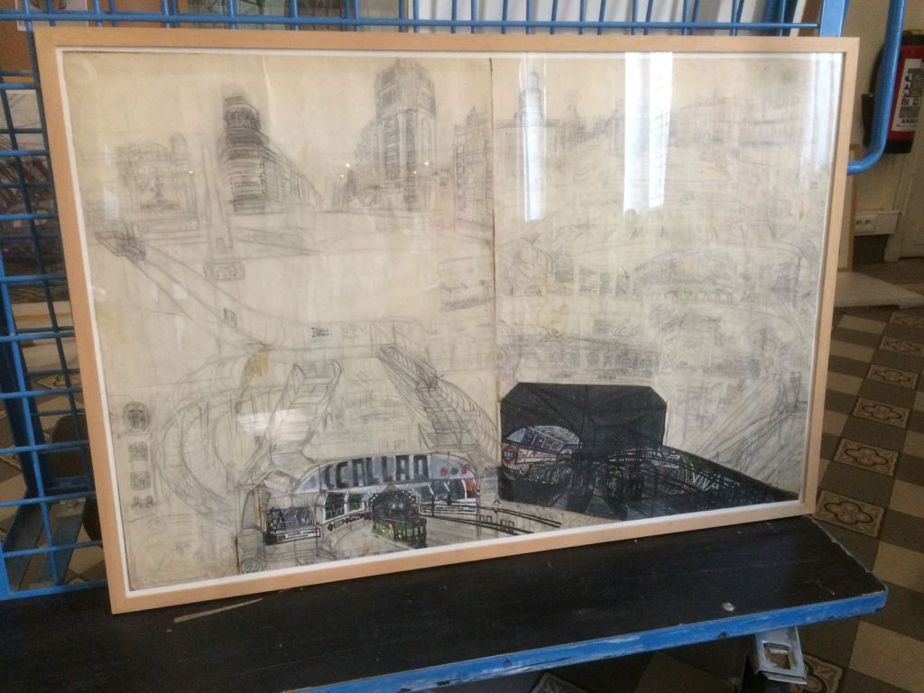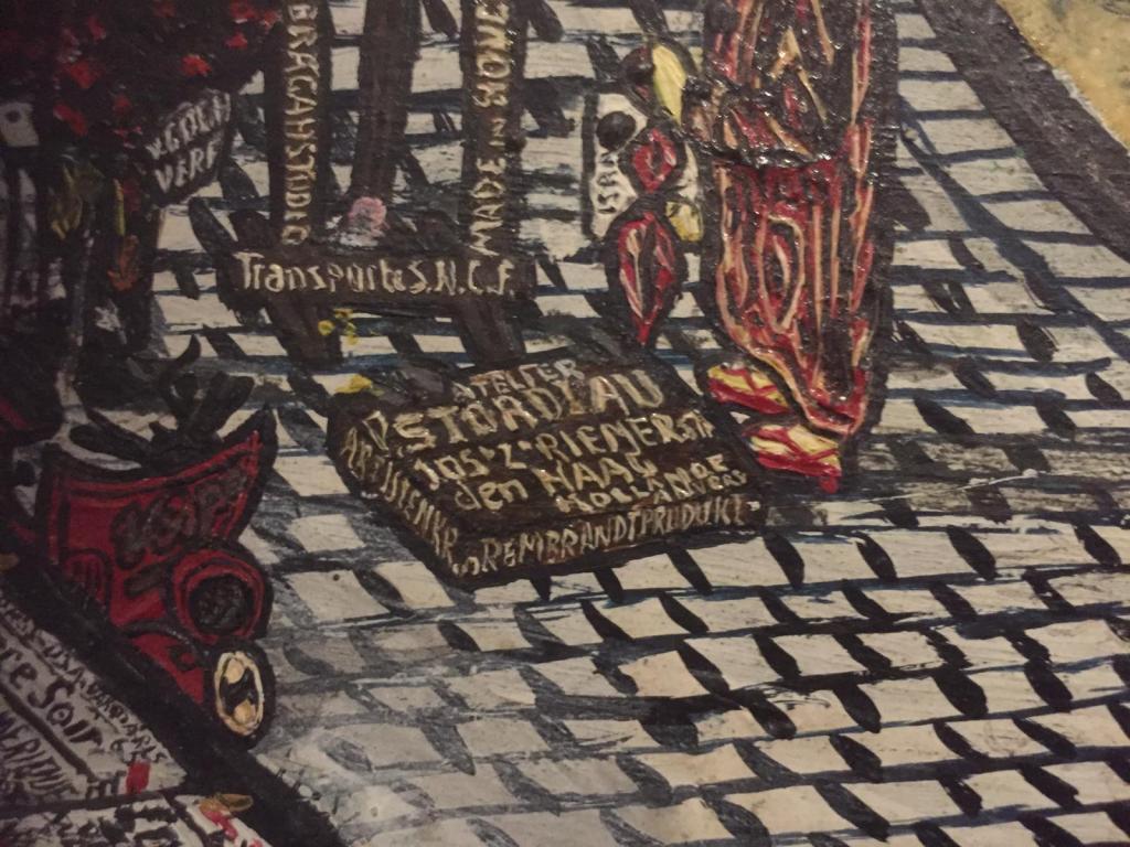 V.l.n.r. het schilderij van Wim Stens, de tekening in de folder van Procedamus in pace en de ets Colonnade van Willem van Genk
