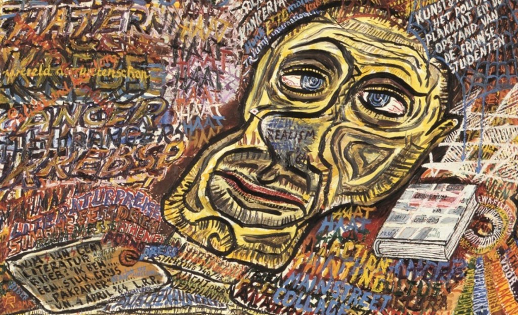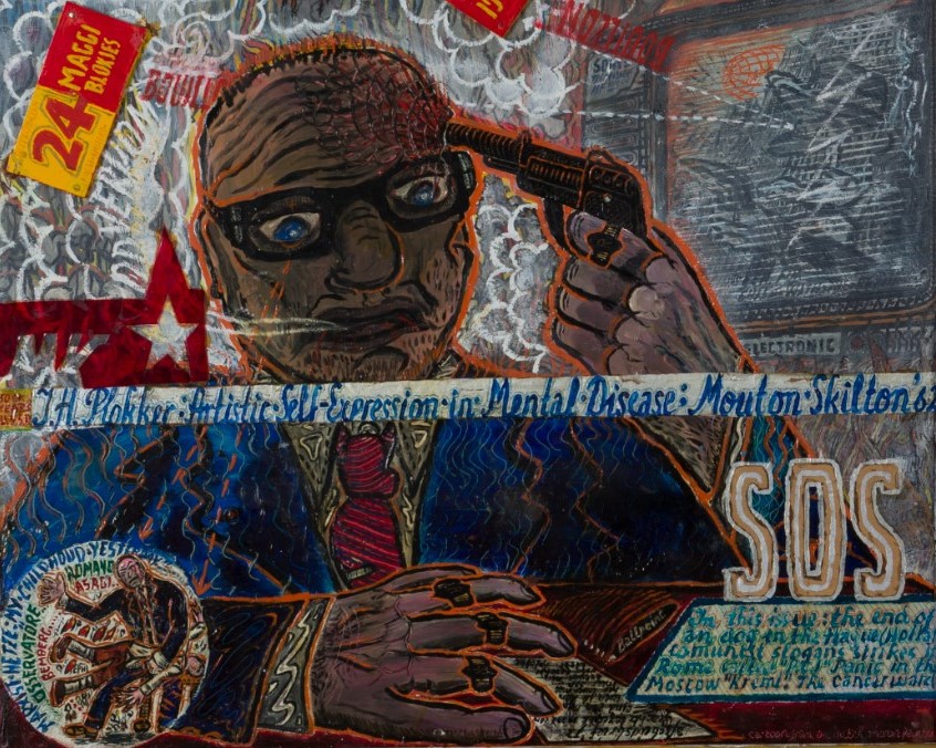 Het is een tafereel waarover veel te zeggen en te hypothetiseren valt. Waar het mij met name om gaat is de drie buizen/reclames/apparaten aan de muur links naast de deuren, steeds met het woord RONSONSERVICE. Eerder signaleerde ik al vergelijkbare beeldelementen op Zelfportret – Zwakzinnigennazorg (WVG-0096) en Zelfportret in De Ark (WVG-0081) en vroeg ik me af wat hier wordt afgebeeld. Helaas biedt ook Paranăsky Kultur geen verklaring. Mocht iemand een idee hebben, over Paranăsky of over RONSONSERVICE, dan zou ik dat graag horen!