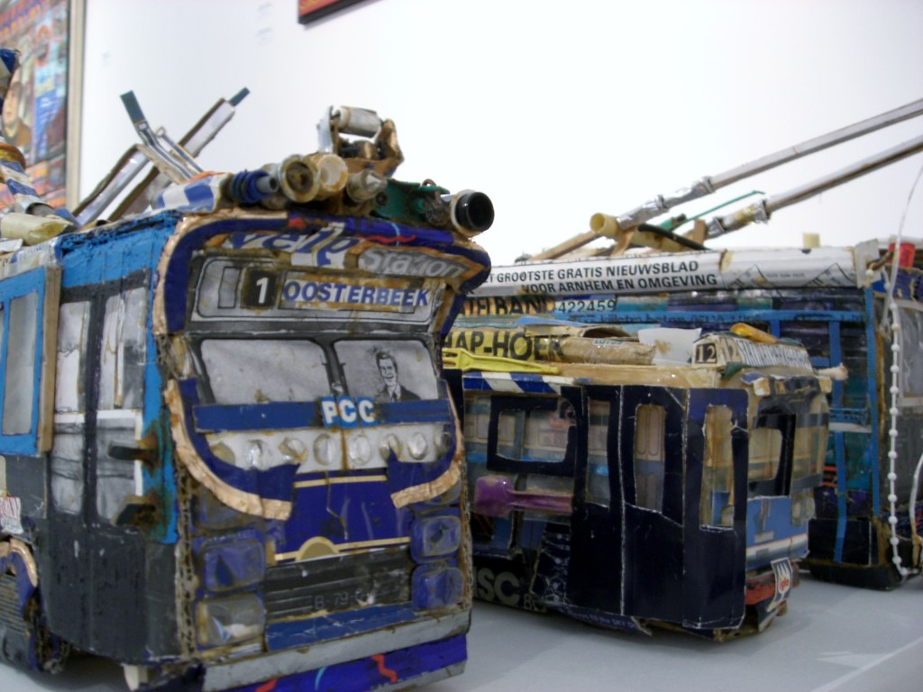 Kartonnen trolleybussen in het Trolley-Bus Museum in Arnhem (foto: Jack van der Weide)