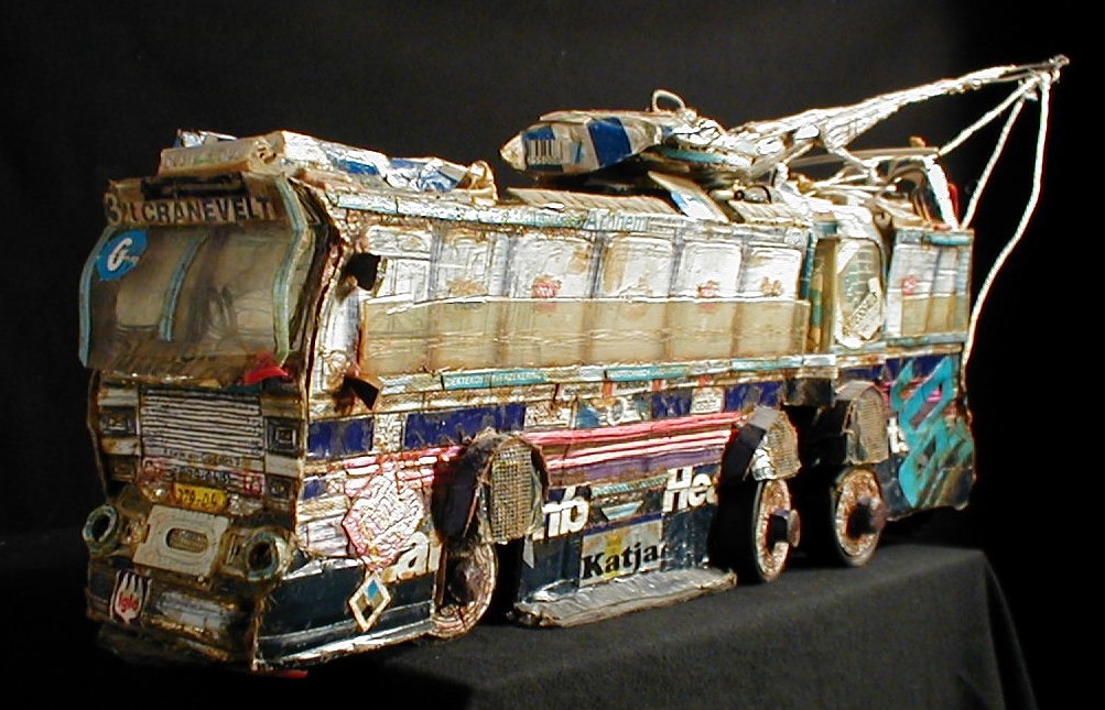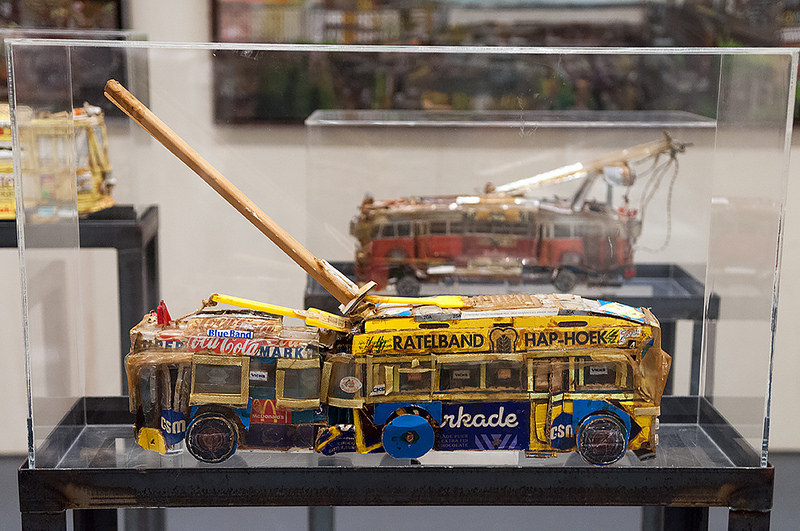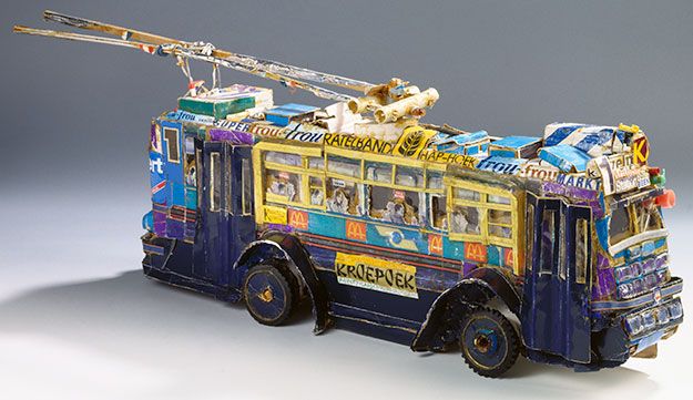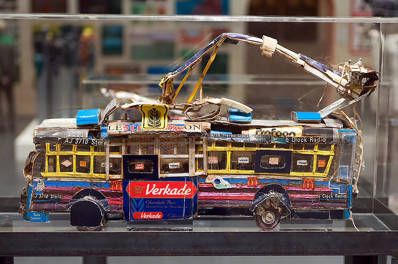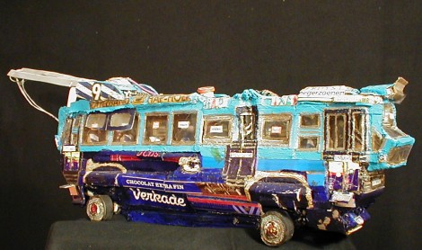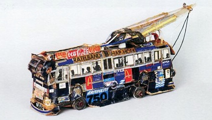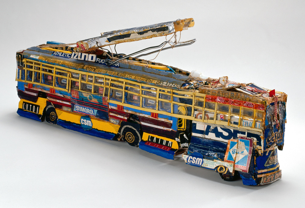 Algemeen: het gaat bij deze assemblage om een trolleybus op basis van een kartonnen model met een toegevoegd deel. De bus heeft zes wielen, de dominante kleuren van het voorste deel zijn geel en blauw.